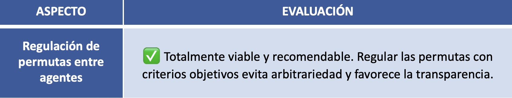 Totalmente viable y recomendable, Regular las permutas con criterios objetivos evita arbitrariedad y favorece la transparencia. Debe aprobarse en el Anexo específico de GUB y, en caso de que se decidiera desarrollar complementariamente mediante Instrucción, ésta no podría contradecir nada de lo acordado en el Anexo. Riesgo jurídico actual: La ausencia de criterios podría generar nulidad parcial por discrecionalidad (art. 9.3 CE - Seguridad jurídica e interdicción de la arbitrariedad).