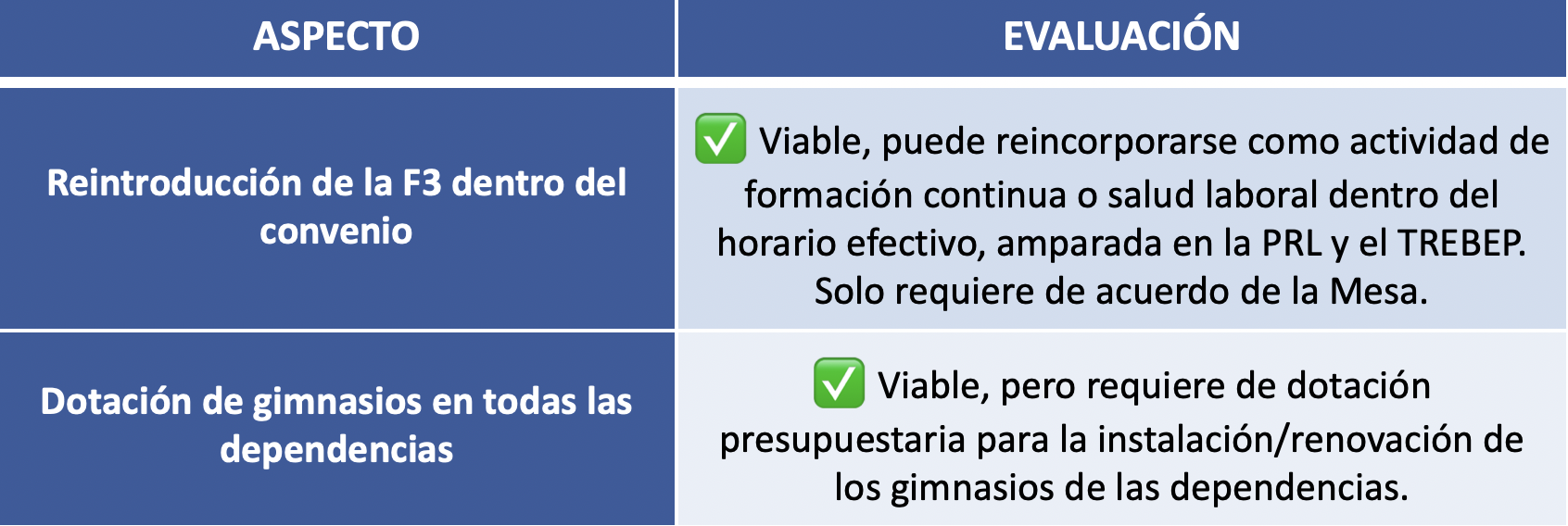 Propuesta plenamente viable. Puede reincorporarse como actividad de formación continua o salud laboral dentro del horario efectivo, amparada en la PRL y en el TREBEP. Solo requiere de acuerdo de la Mesa y dotación presupuestaria para instalaciones.