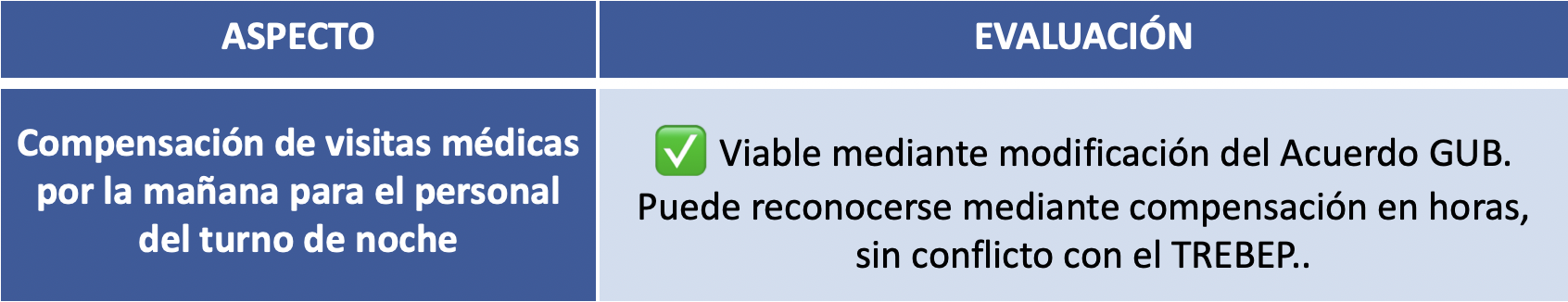 - Acuerdo GUB, Título II (Permisos y licencias): Reconoce permisos retribuidos para asistencia médica, pero no diferencia entre turnos.
