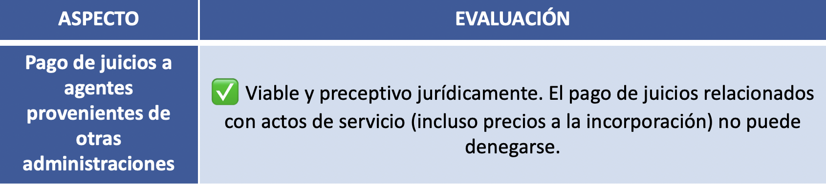 Viable y preceptivo jurídicamente. El pago de juicios relacionados con actos de servicio (incluso precios a la incorporación) no puede denegarse sin vulnerar el derecho a la defensa, En caso de denegación, sería impugnable ante el contencioso-administrativo. Es importante recordar que este precepto no aplica a hechos personales o disciplinarios ajenos al servicio.