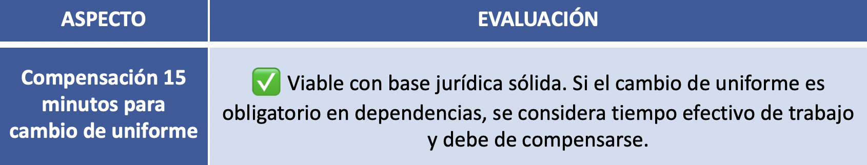 Viable y con base jurídica sólida. Si el cambio de uniforme es obligatorio en dependencias, se considera tiempo de trabajo efectivo y debe de compensarse. Requiere modificación del Acuerdo o Instrucción interna para computarlo oficialmente (vía compensación en días de descanso).